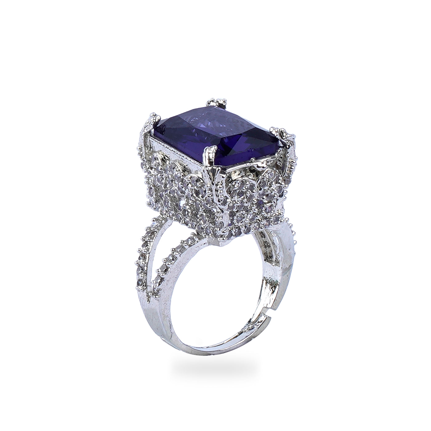 SIZE: Adjustable (Free Size – fits most finger sizes) COLOR: Silver METAL FINISH / COLOR: Rhodium Plated (Silver Tone) STONE COLOR: Amethyst PACKAGING: Delivered in eco-friendly packaging