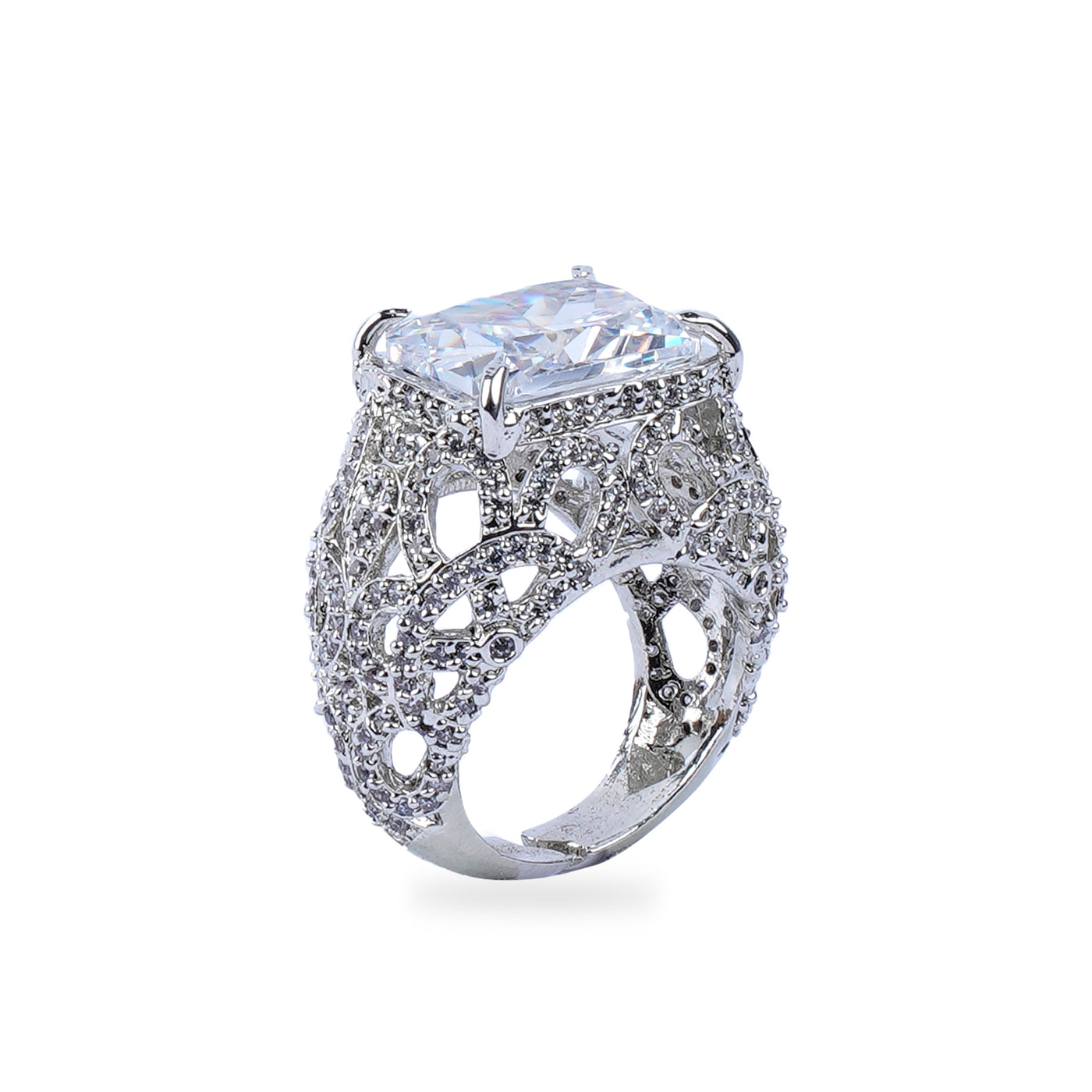 SIZE: Adjustable (Free Size – fits most finger sizes) COLOR: Silver METAL FINISH / COLOR: Rhodium Plated (Silver Tone) STONE COLOR: Clear/White PACKAGING: Delivered in eco-friendly packaging