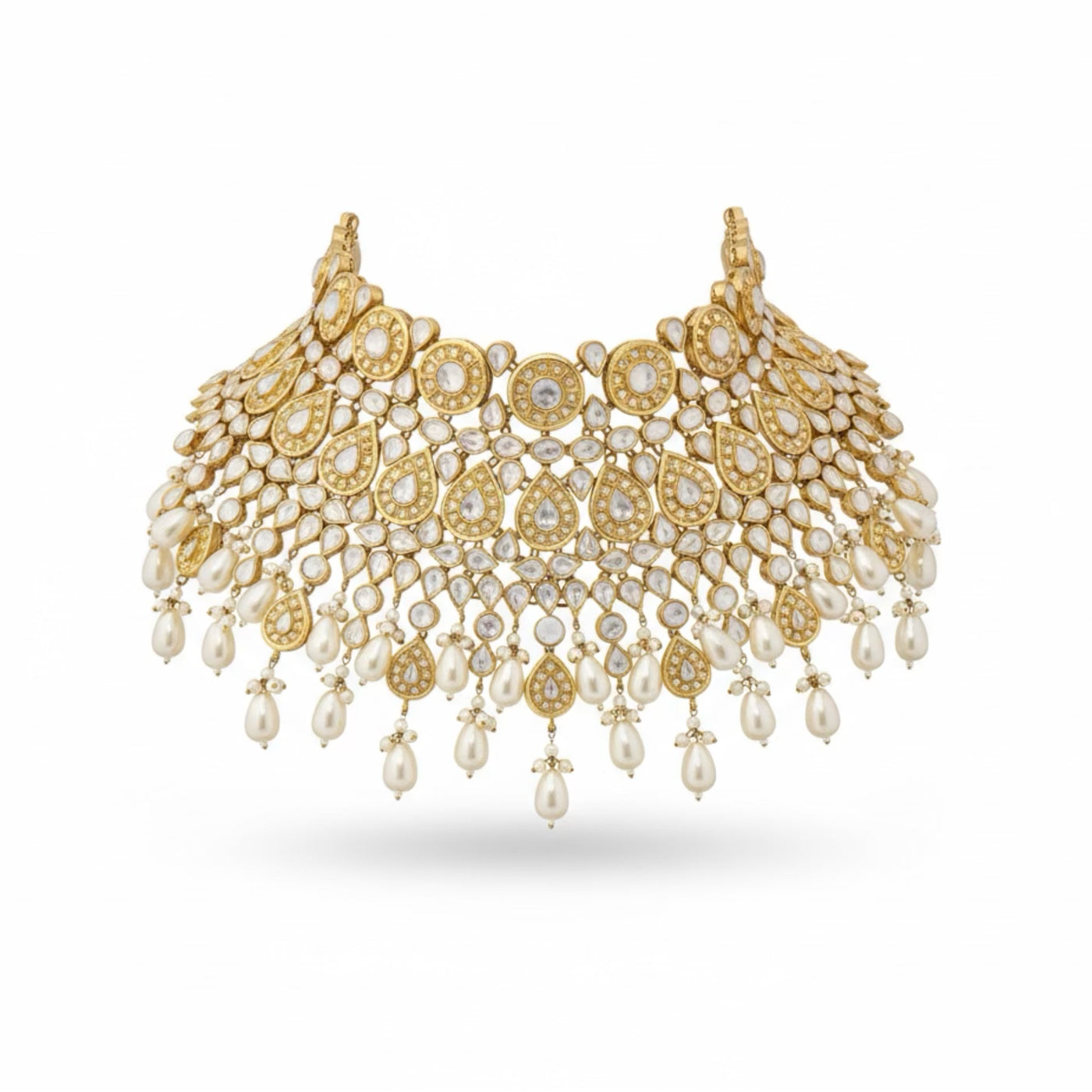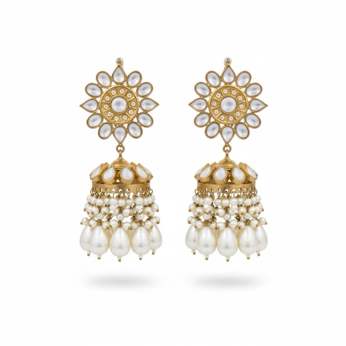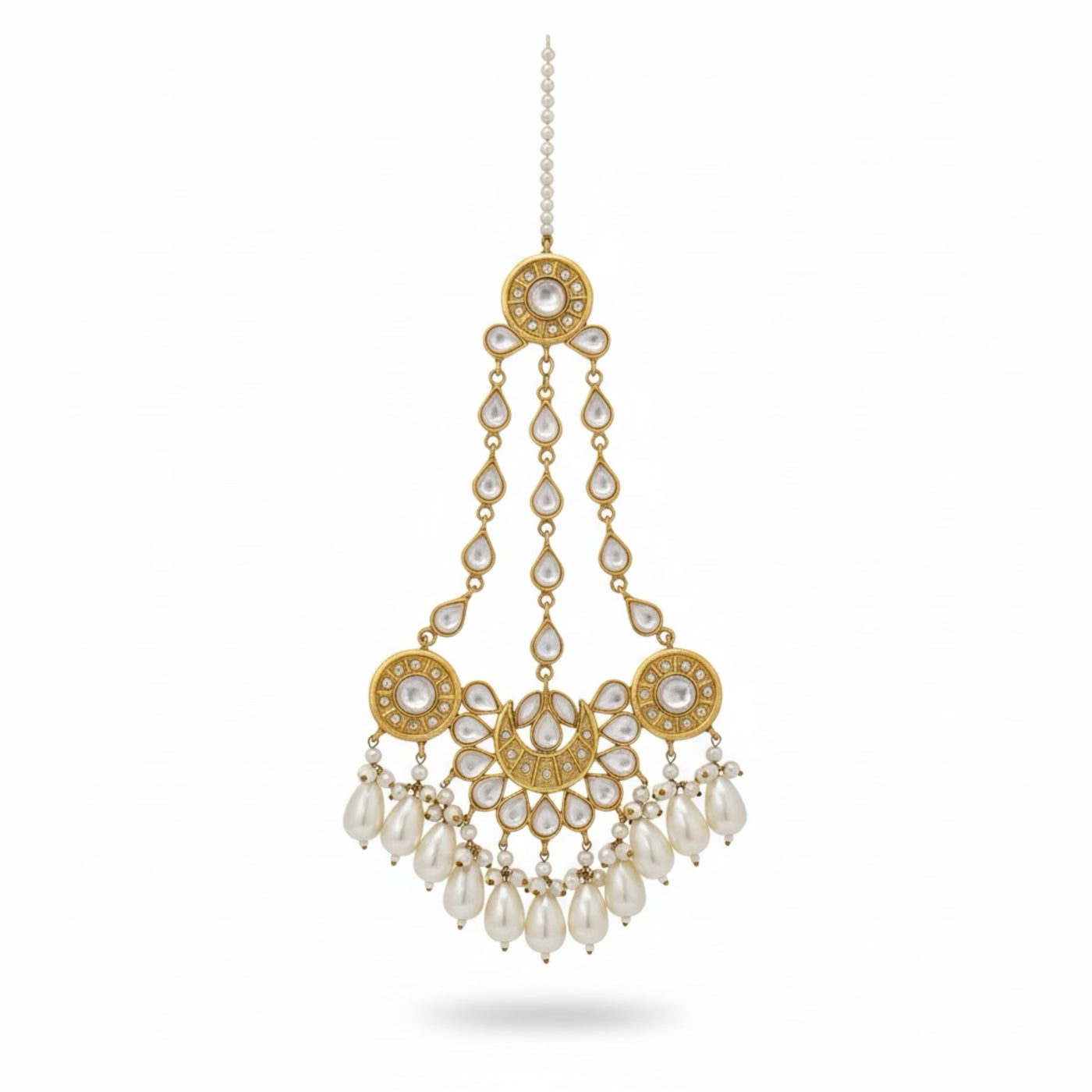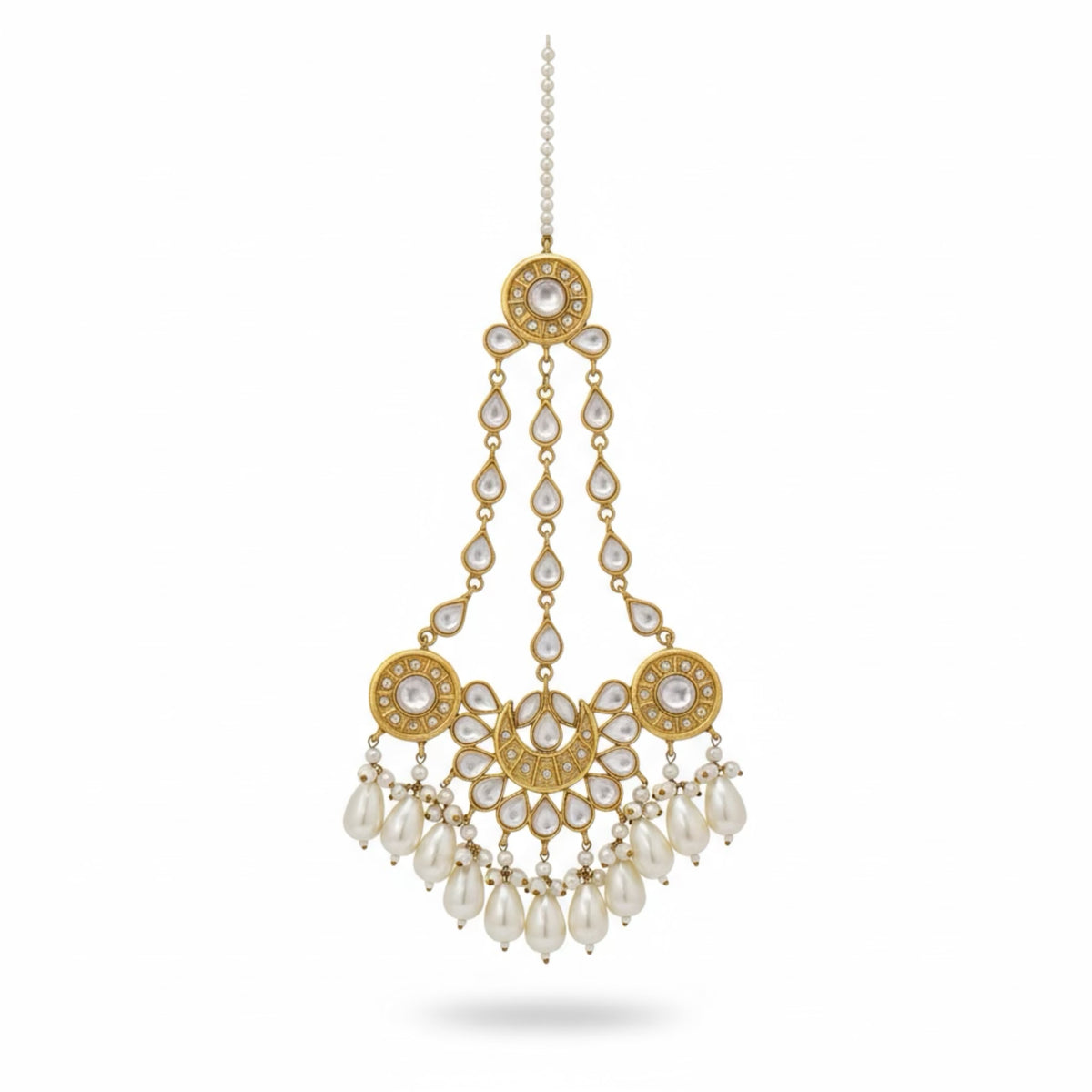 COLOR: Gold METAL FINISH / COLOR: Premium Gold Plated Finish STONE TYPE: Traditional Kundan Stones STONE COLOR: Pearl CRAFT STYLE: Handcrafted Traditional Kundan Artistry WEIGHT: Lightweight & Comfortable for Long Wear PACKAGING: Delivered in Elegant White Eco-Friendly Packaging