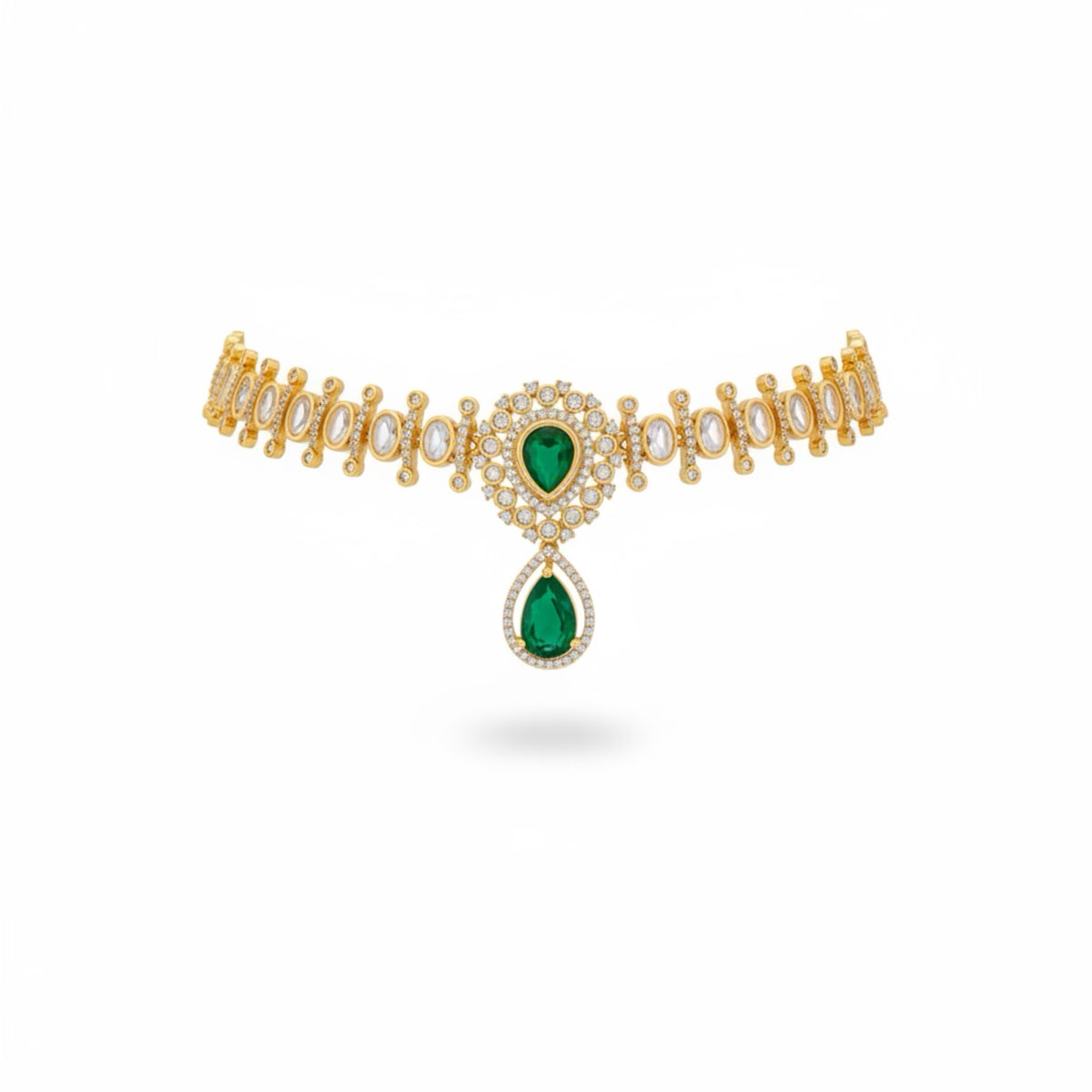 COLOR: Gold METAL FINISH / COLOR: Premium Gold Plated Finish STONE TYPE: Traditional Kundan Stones STONE COLOR: Emerald CRAFT STYLE: Handcrafted Traditional Kundan Diamond Artistry WEIGHT: Lightweight & Comfortable for Long Wear PACKAGING: Delivered in Elegant White Eco-Friendly Packaging