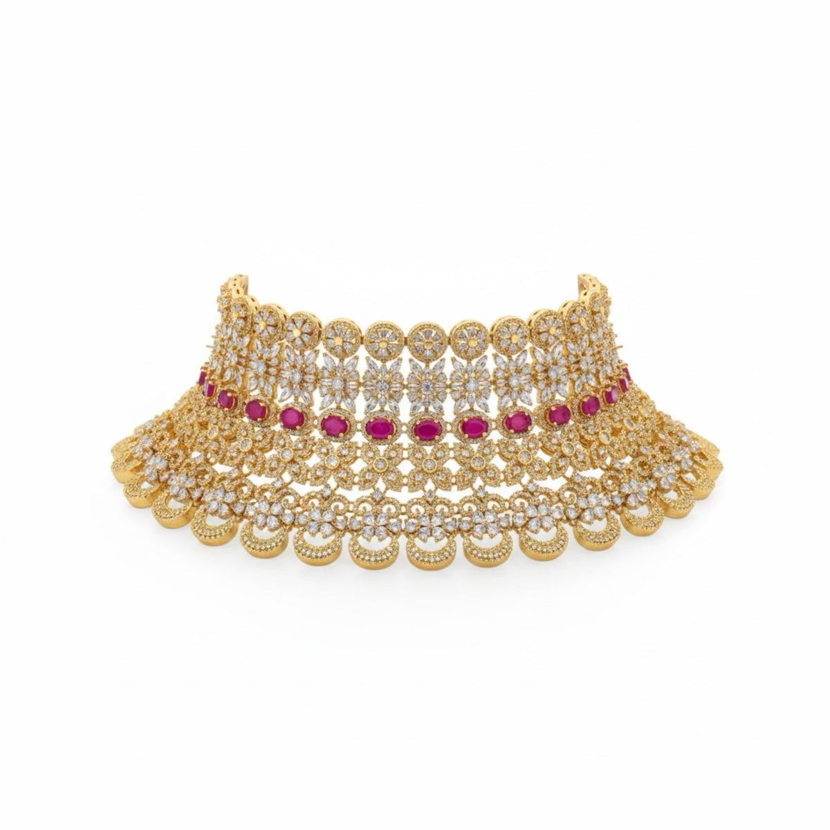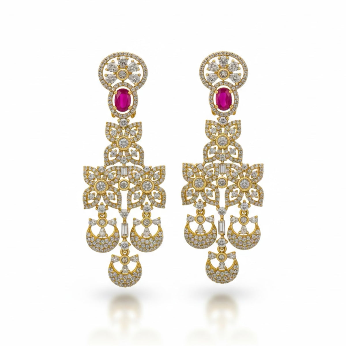 FINISH: Gold Plated STONES: Brilliant-Cut Diamond-Like Stones with Elegant Accents STONE COLOR: Ruby CRAFT: Precision Crafted Luxury Design WEIGHT: Lightweight & Refined Comfort PACKAGING: Delivered in White Eco-Friendly Packaging