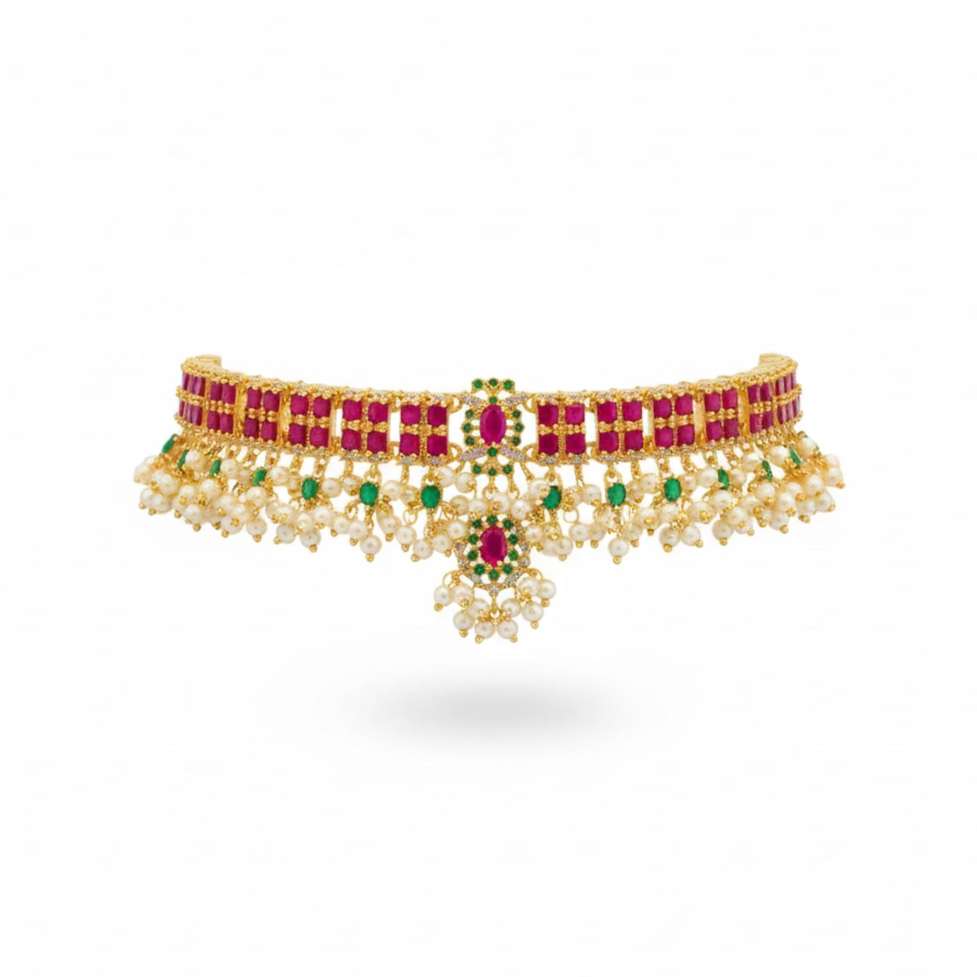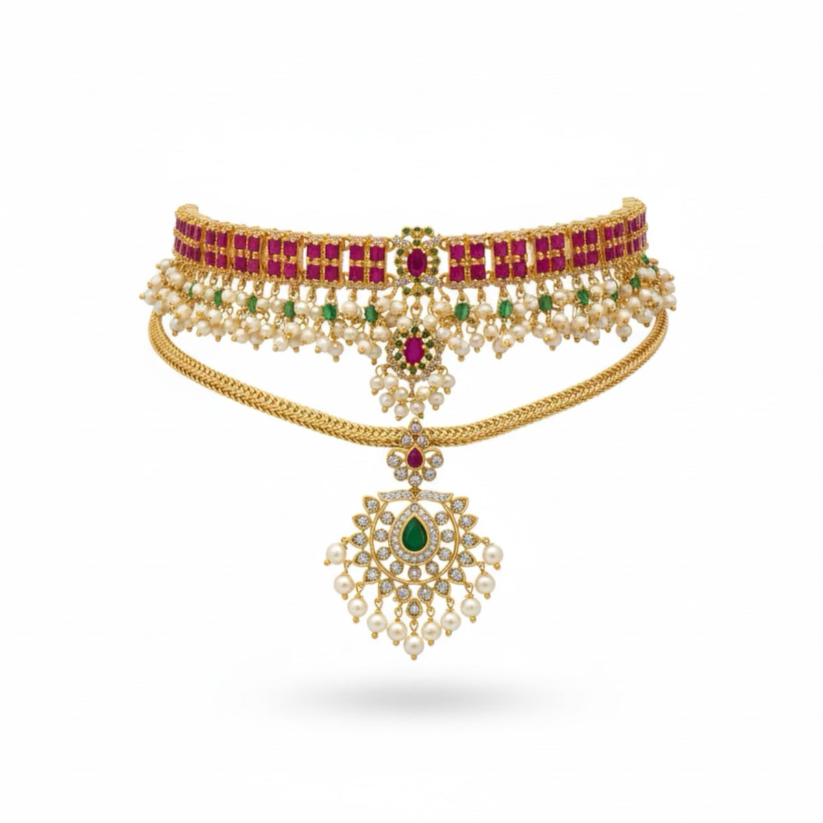 DESIGN CONCEPT: The necklace is divided into two detachable necklines, allowing it to be styled together for a grand look or worn separately for a minimal statement. FINISH: High-Polish gold Plated STONES: Brilliant-Cut Diamond-Like Stones with Elegant Accents STONE COLOR: Ruby/Emerald WEIGHT: Lightweight & Refined Comfort Exclusivity: Each piece is handcrafted in limited quantity and exclusive to SEM’S. PACKAGING: Delivered in White Eco-Friendly Packaging