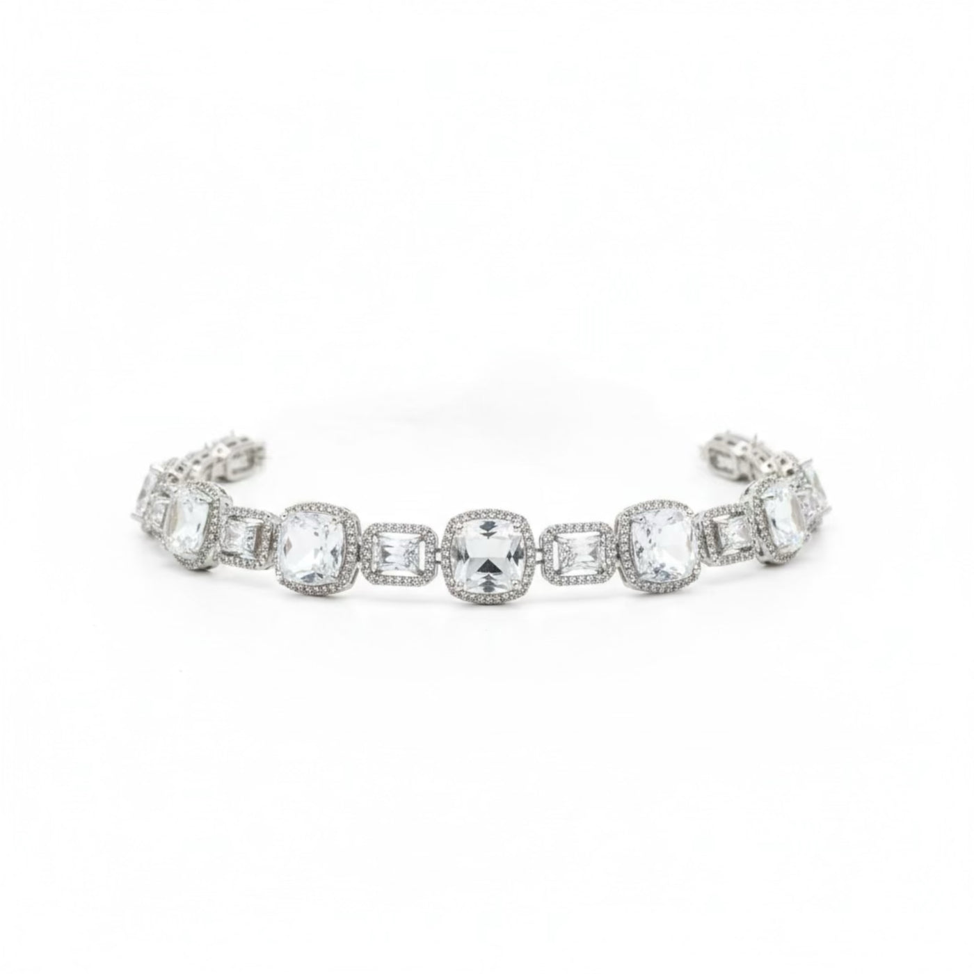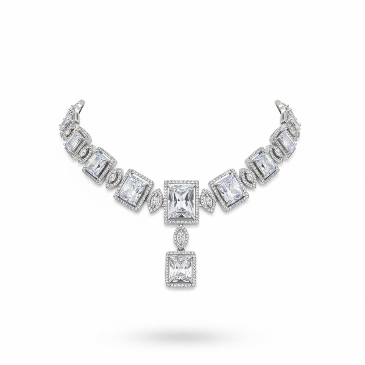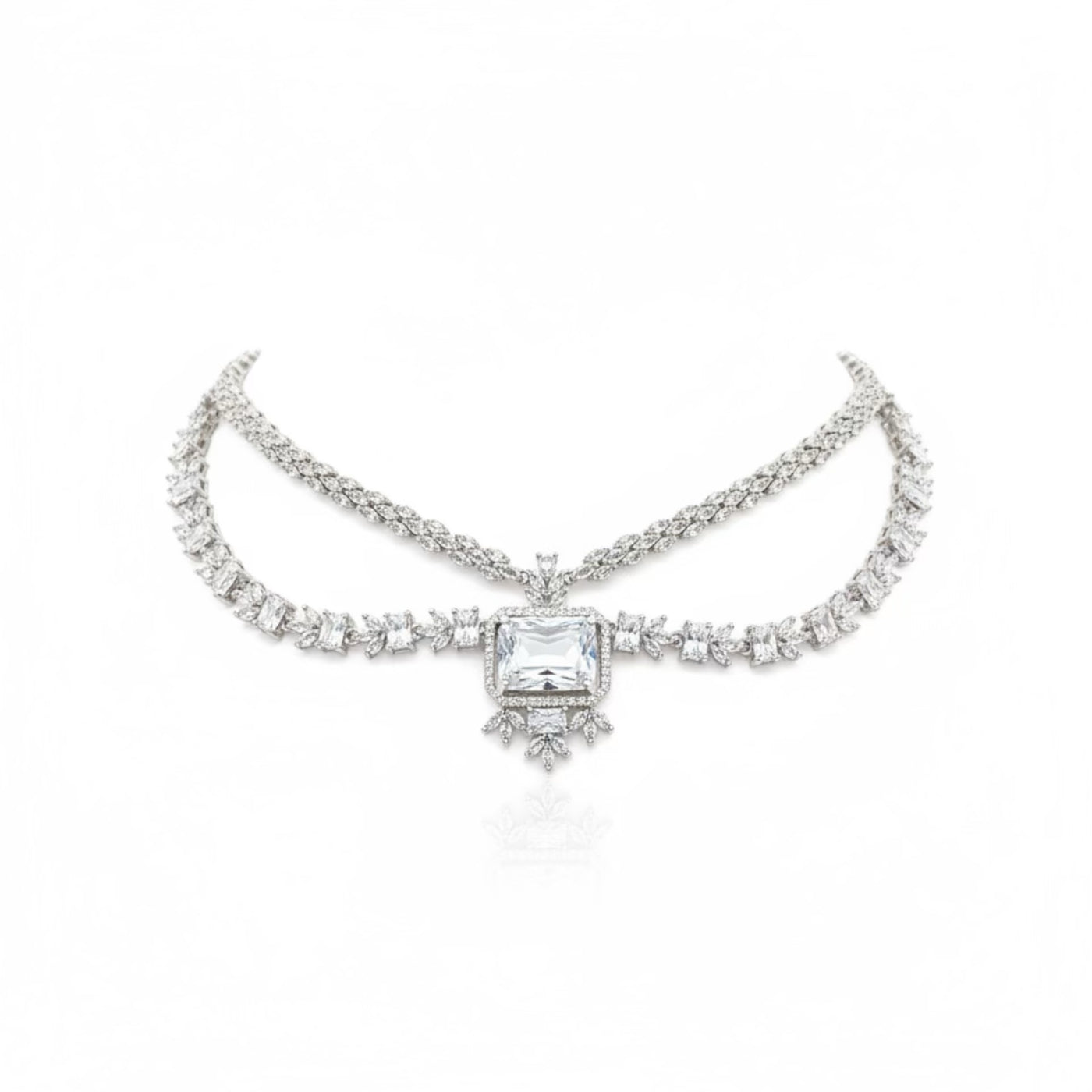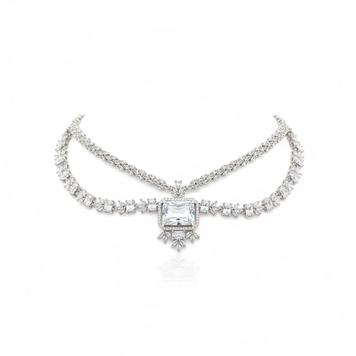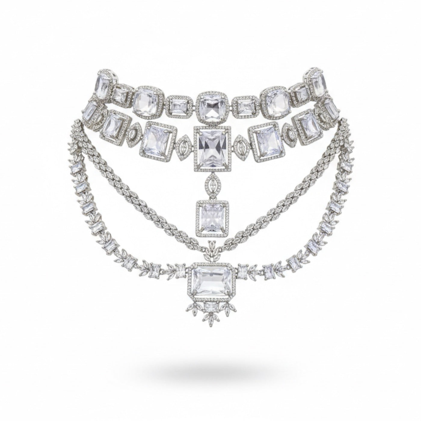 DESIGN CONCEPT: The necklace is divided into three detachable necklines, allowing it to be styled together for a grand look or worn separately for a minimal statement. FINISH: High-Polish Rhodium Plated STONES: Brilliant-Cut Diamond-Like Stones with Elegant Accents STONE COLOR: Clear/White WEIGHT: Lightweight & Refined Comfort Exclusivity: Each piece is handcrafted in limited quantity and exclusive to SEM’S. PACKAGING: Delivered in White Eco-Friendly Packaging